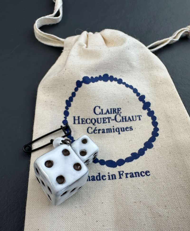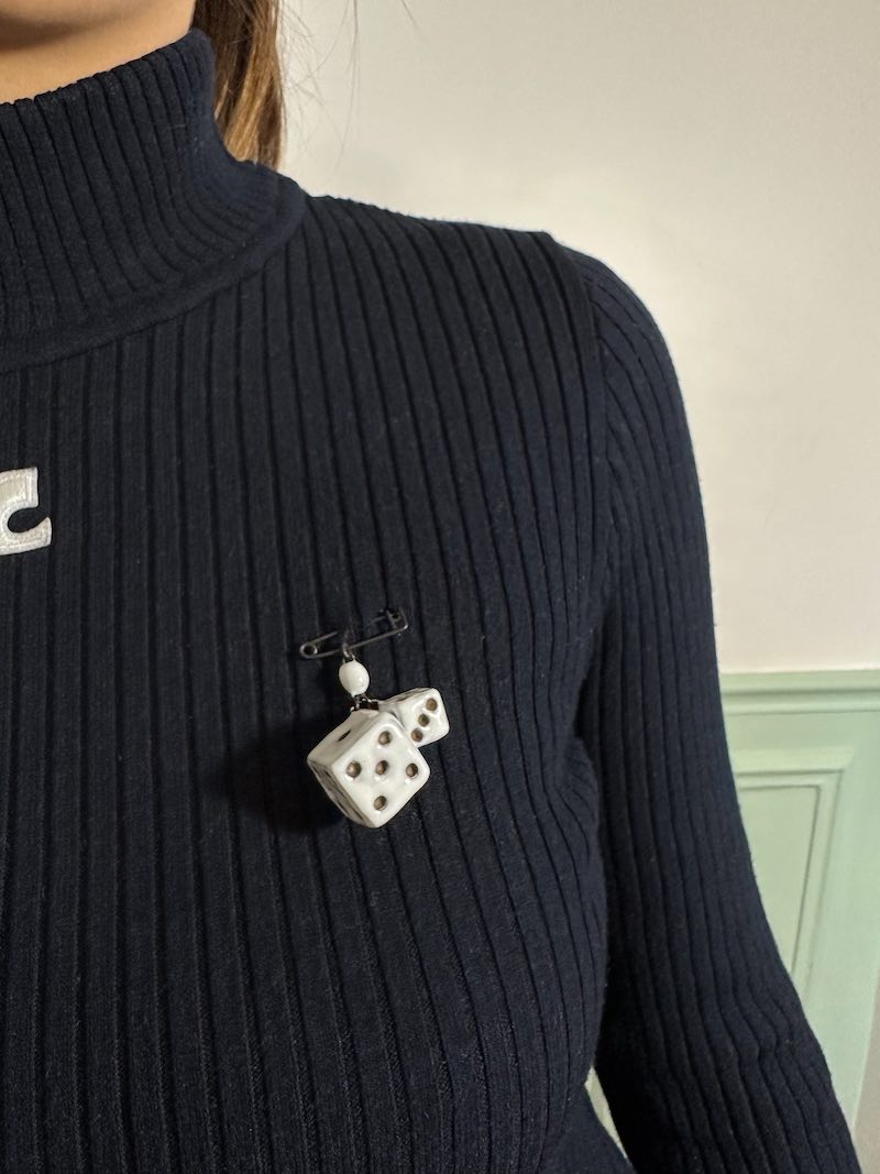 La broche "Dés" est entièrement émaillée et façonnée à la main en France par la céramiste Claire Hecquet-Chaut. Et toujours suivant une fabrication à l'ancienne.Chaque broche est réalisée dans son atelier, selon des techniques traditionnelles de céramique. Les dés sont sculptés avec soin, puis émaillés pour obtenir un rendu lumineux, durable et légèrement brillant.